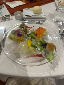 前菜担当は新入社員の伴野です。ヒラメや鱒を使ったオードヴルで、野菜のテリーヌもあり、色鮮やかでした。
