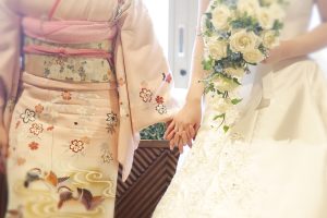 和装に描かれた花々と ウエディングドレスの純白