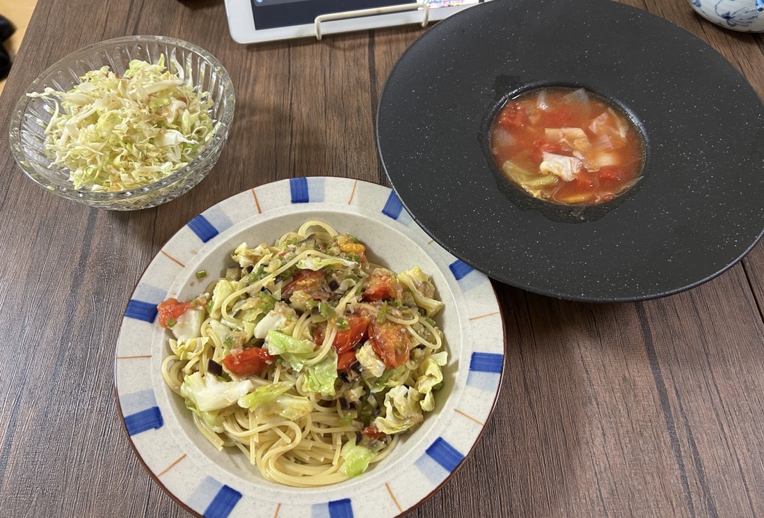 キャベツのサラダやトマトスープで軽く整える日もあれば、